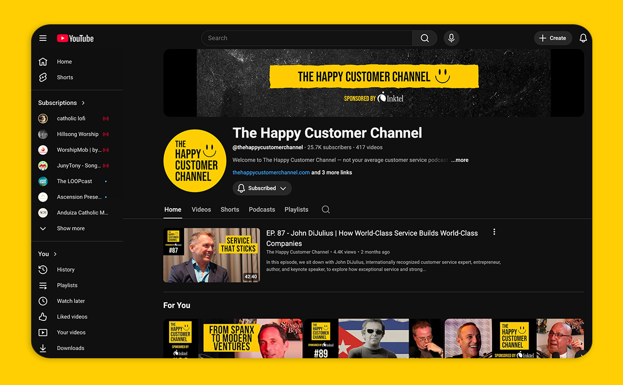 The Happy Customer Channel is a branded podcast developed to position Inktel as a thought leader in customer experience. I led visual identity design and production, overseeing video and audio editing, short-form content creation, and platform distribution.